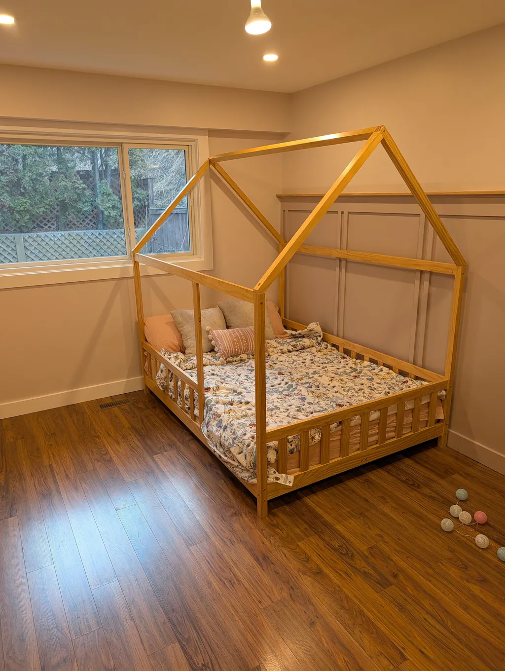 As someone who loves all things Montessori, I am happy we went with this bed for my daughter's first floor bed. The colour and quality of the wood is my favourite part. The side railings were really tricky for me to get together, caused some grey hairs for sure. The top part of the house is not as sturdy as I would have thought. I was laying with my daughter on the bed and tried to support getting up with the side (I only weigh 120 pounds) and the wood was creaking like it would crack so I immediately let go. Otherwise beautiful and a great option for a floor bed!