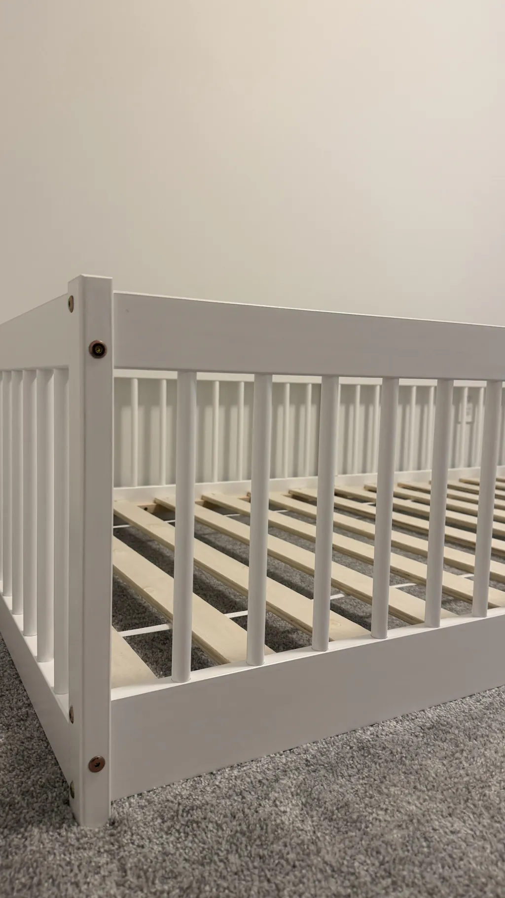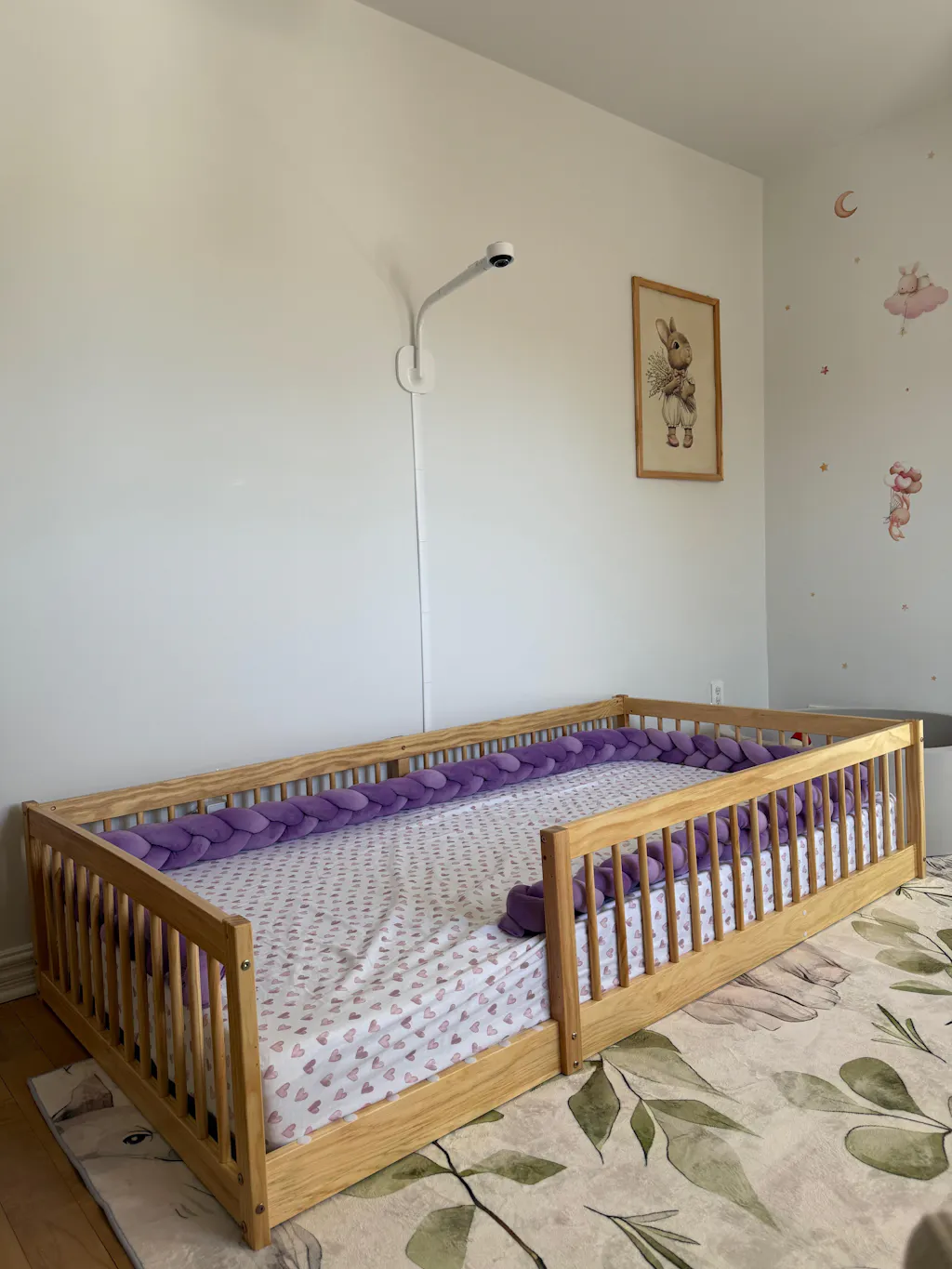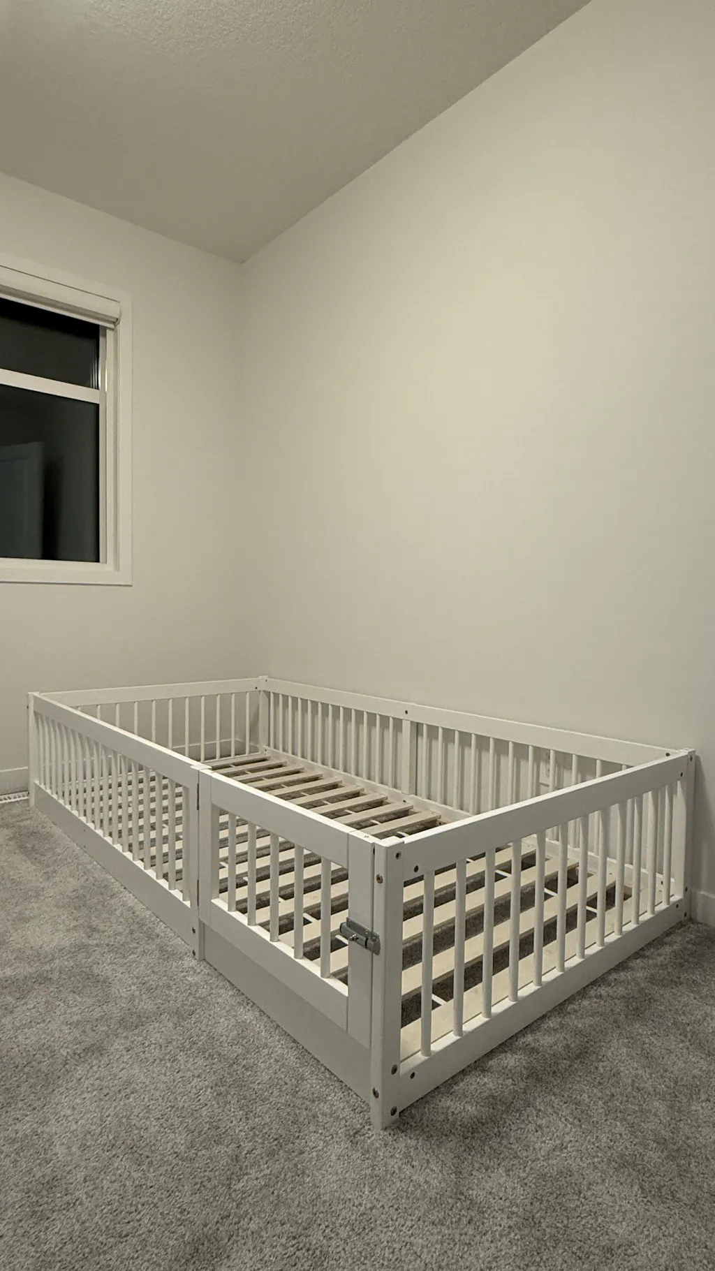 This Montessori bed is level to the ground, and it sits on top of slats (included), making it easier for kids to climb in and out of bed independently.