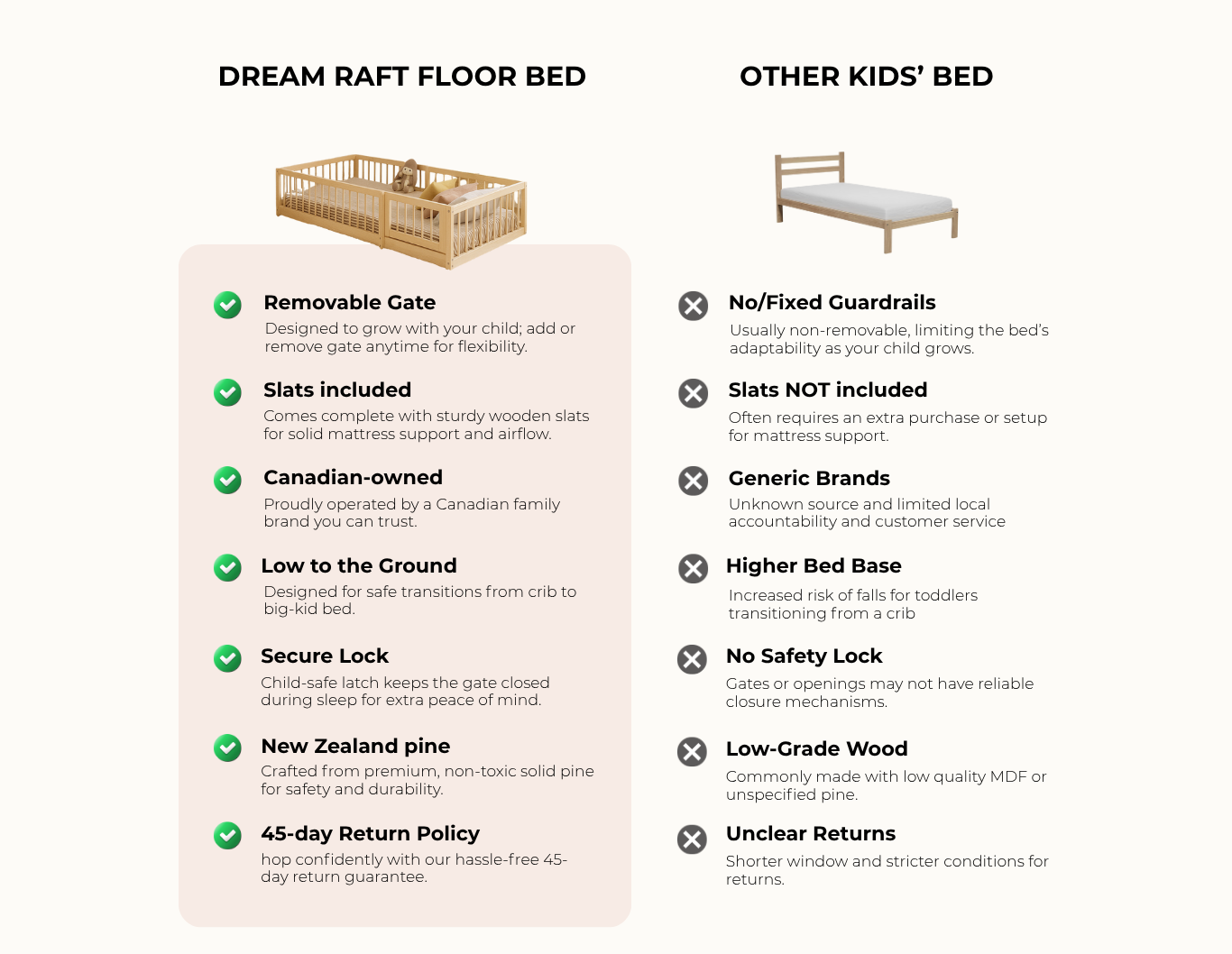 SAFE AND SECURE: For your little one's safety, the four sides of the bed are equipped with protective guardrails to prevent accidental falls. Our Dream Raft bed also comes with slats.