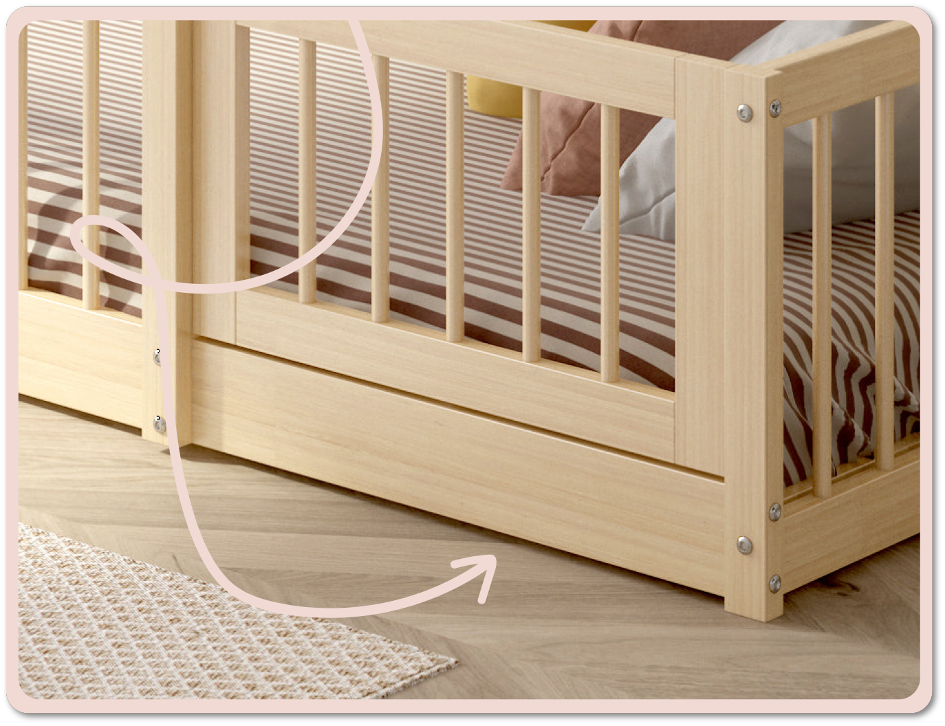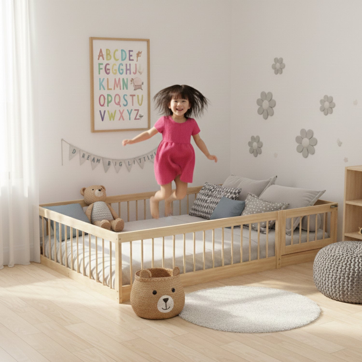 Our floor bed is designed with the Montessori ethos of freedom. Its ground-level design nurtures independence, allowing children to explore their environment safely and freely.