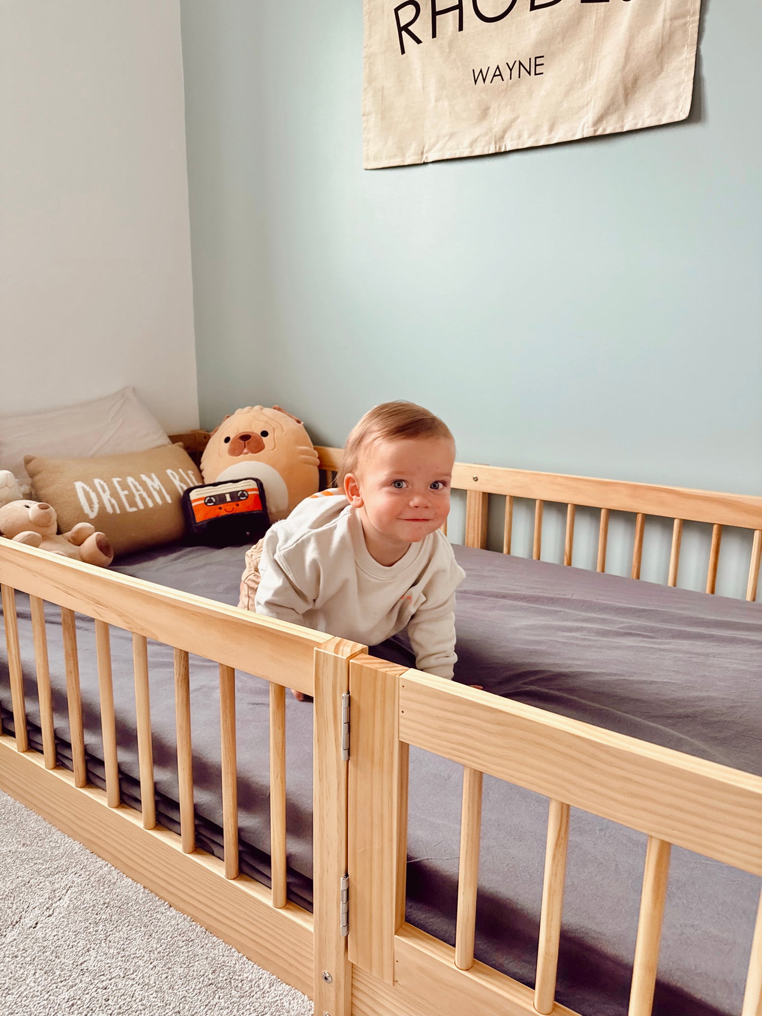This Montessori bed is level to the ground, and it sits on top of slats (included), making it easier for kids to climb in and out of bed independently.