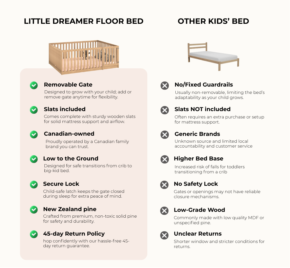 Make the switch from crib to big kid bed smooth and empowering with our Montessori-inspired floor bed is designed to support your child’s growing sense of independence, with a low-to-the-ground frame.
